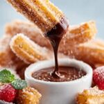 Servieren Sie die noch warmen Churros sofort, am besten mit warmer Schokoladensauce oder frischen Beeren für einen zusätzlichen Genussmoment.