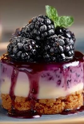 Einzelne Brombeer-Käsekuchen-Parfaits mit Graham-Cracker und Minze